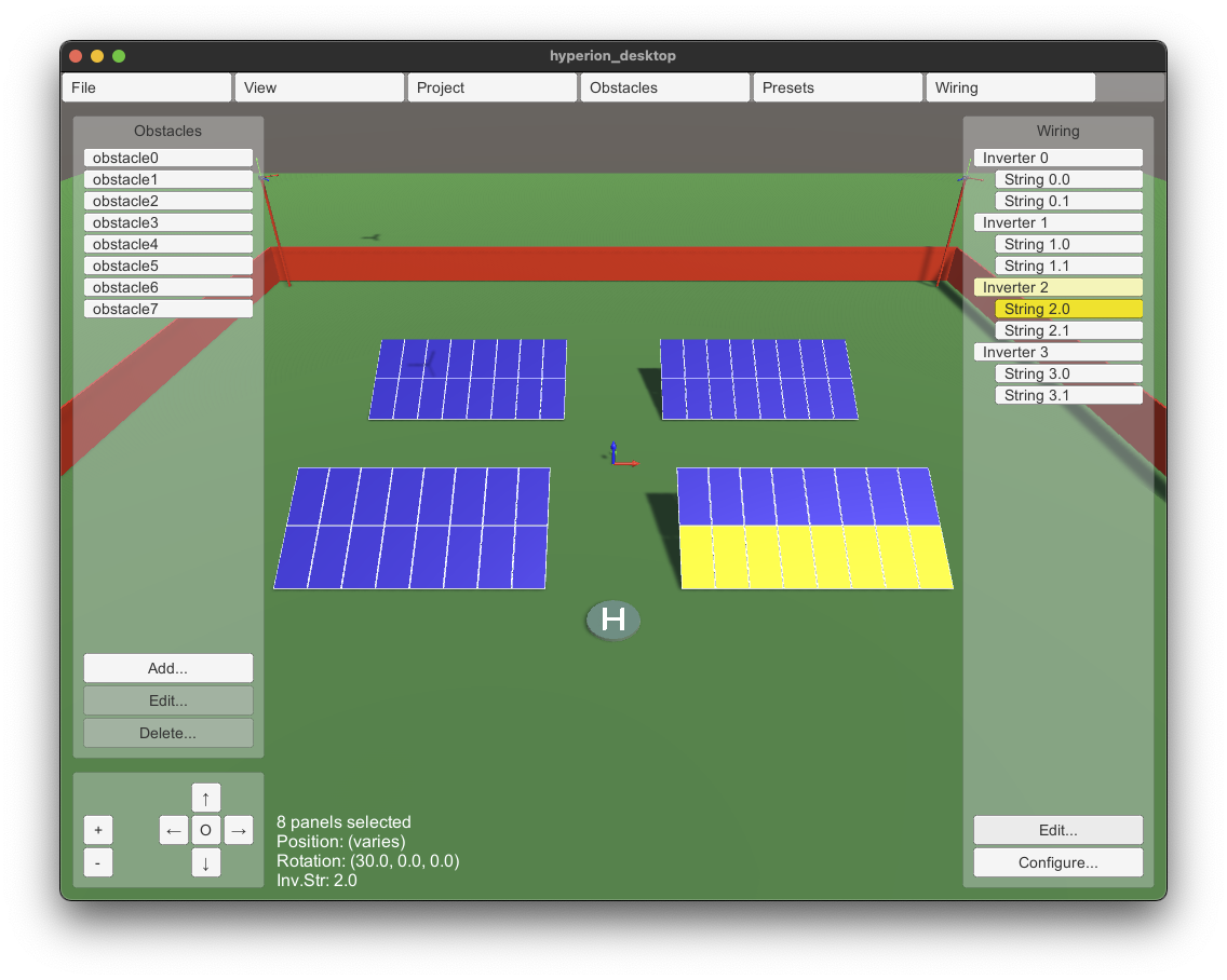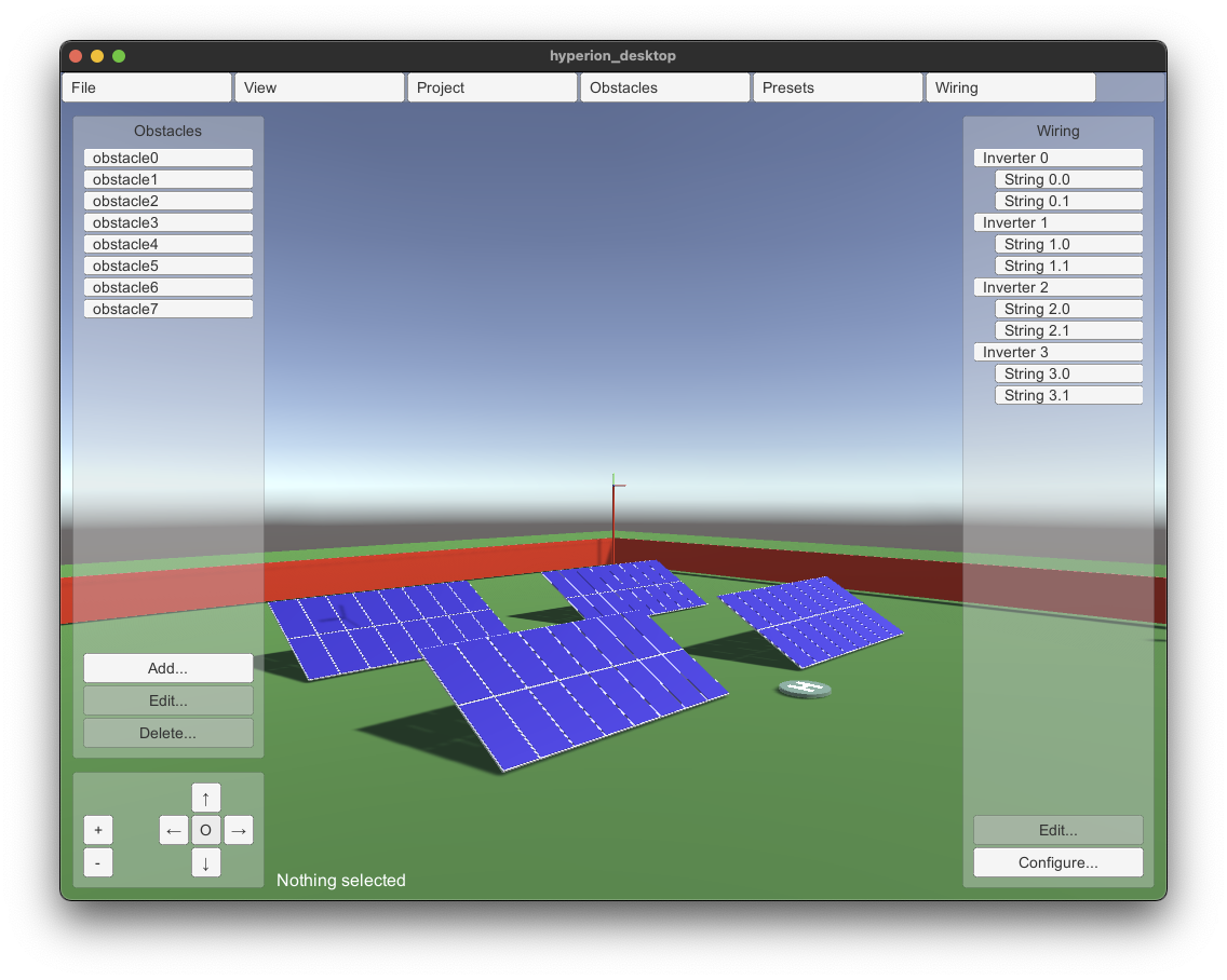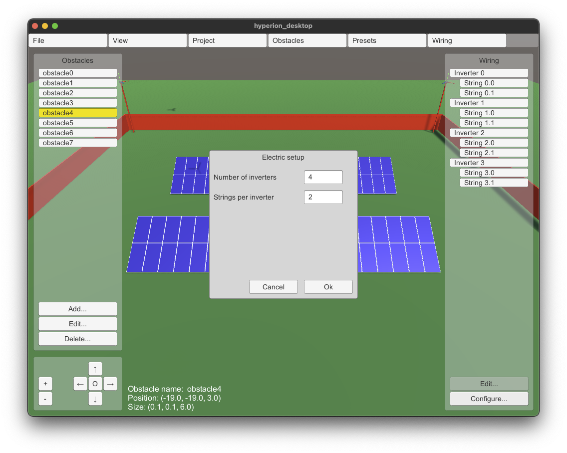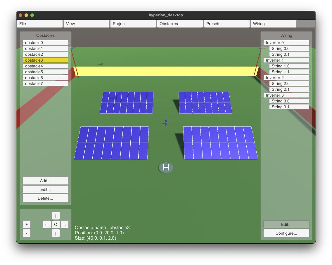 The first version of HYPERION's desktop interface has been delivered by Pygolampis and distributed to the other partners for experimentation. The current version allows entry of the photovoltaic plant's electrical circuity (e.g. which panel belongs to which inverter and which string). Ir also allows the definition of "obstacles" (dangerous areas for the robot to avoid) and the definition of preset drone poses.