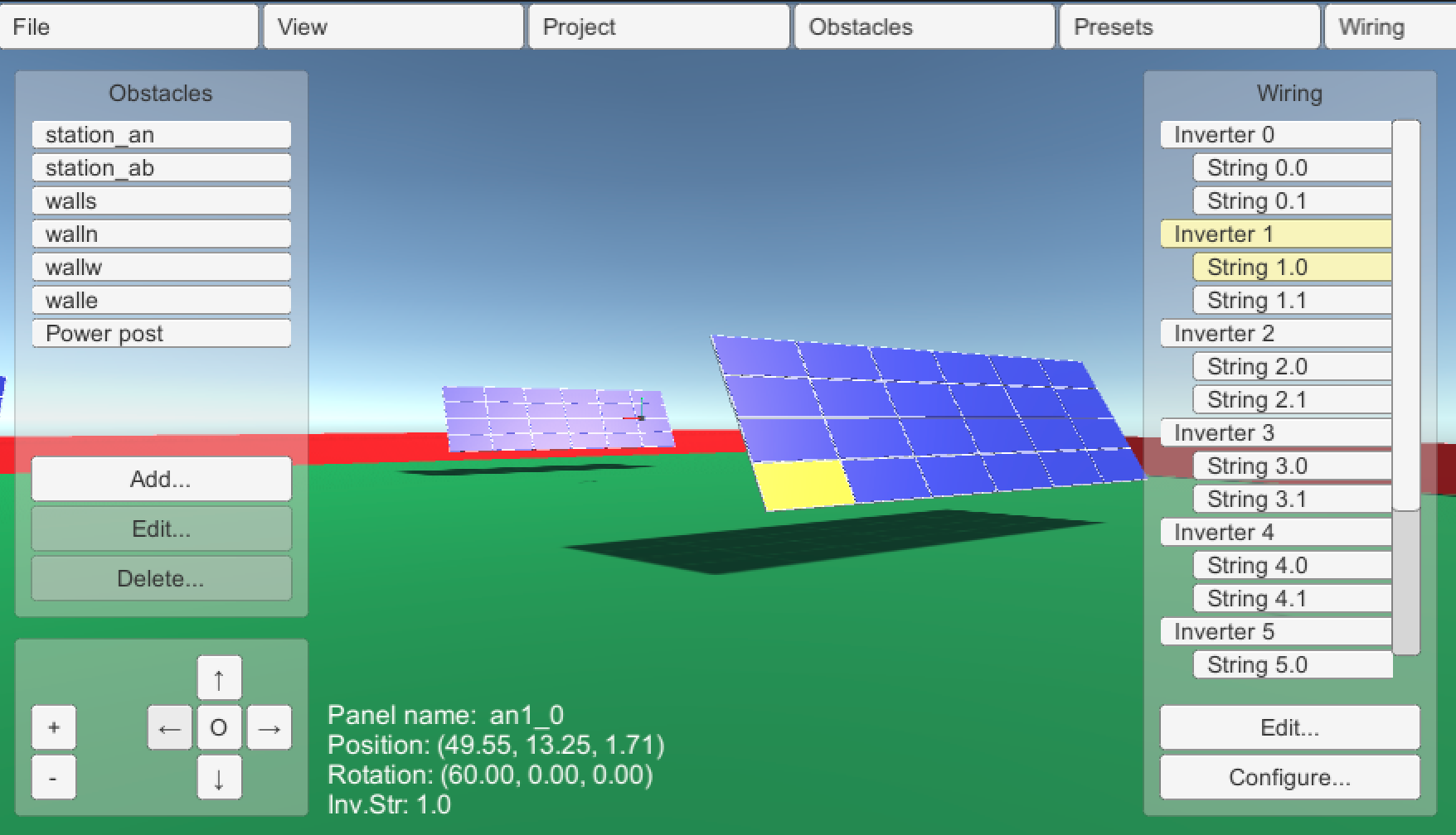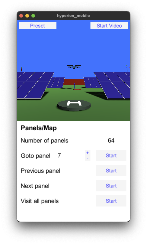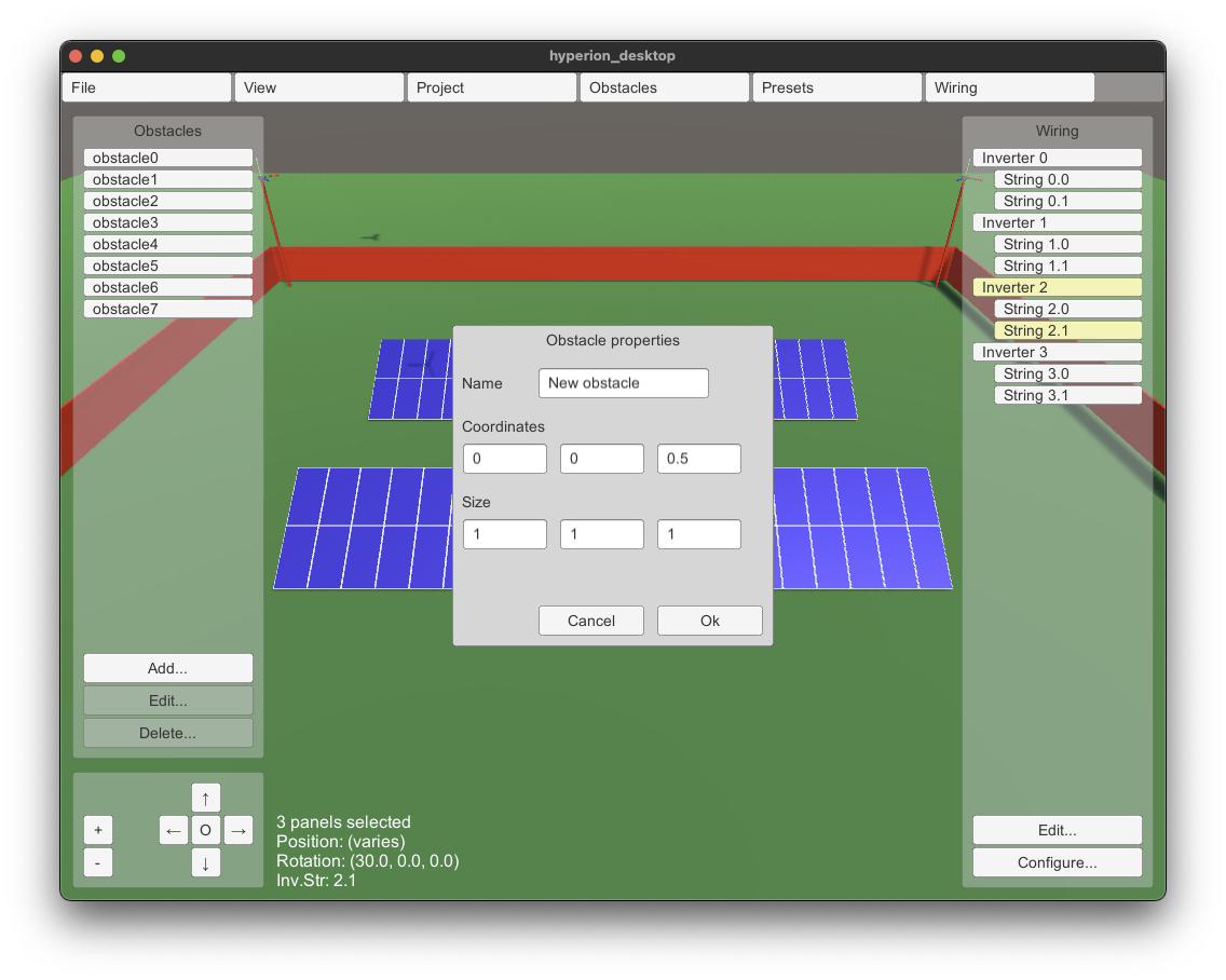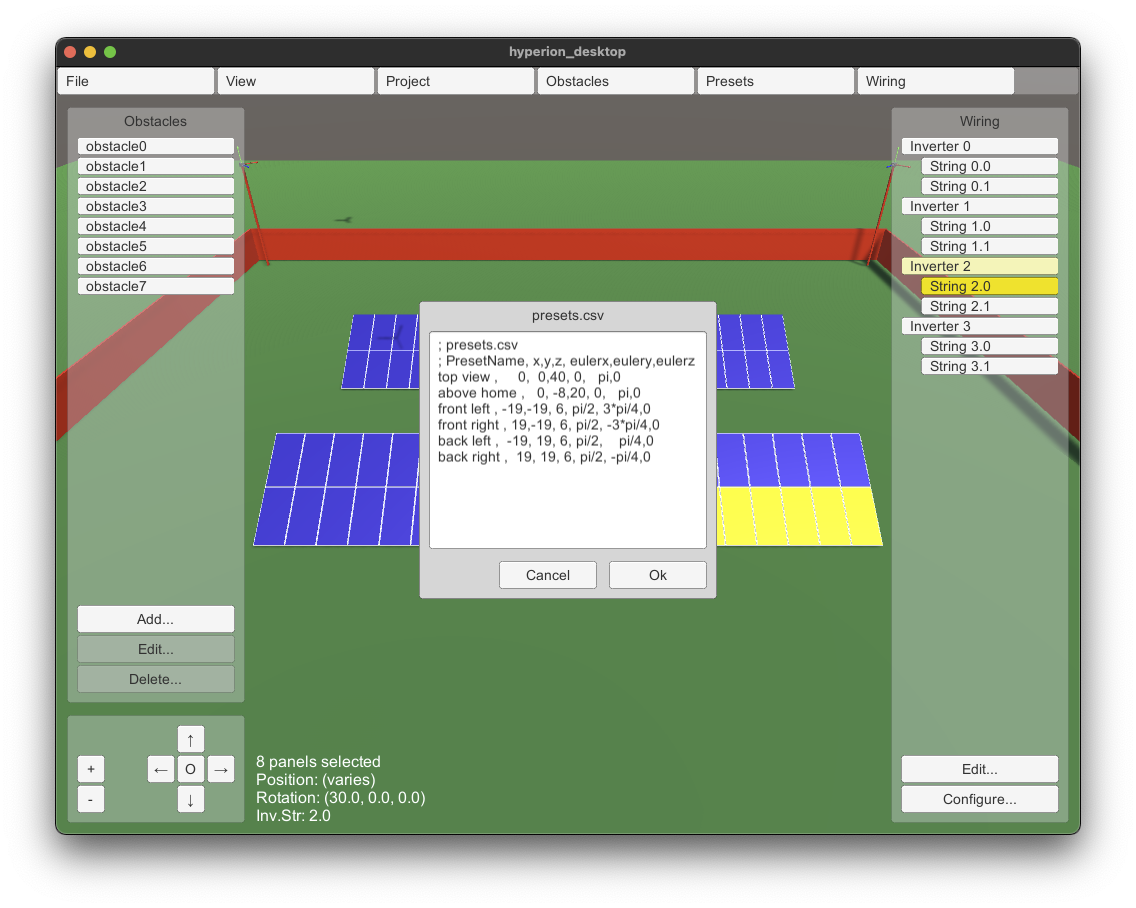The first version of HYPERION's desktop interface has been delivered by Pygolampis and distributed to the other partners for experimentation. The current version allows entry of the photovoltaic plant's electrical circuity (e.g. which panel belongs to which inverter and which string). Ir also allows the definition of "obstacles" (dangerous areas for the robot to avoid) and the definition of preset drone poses.
