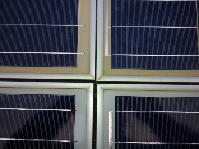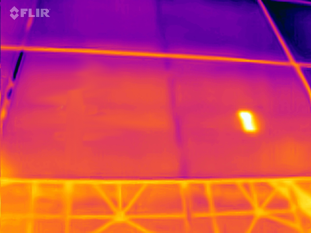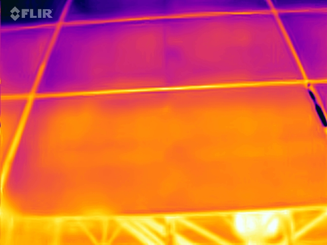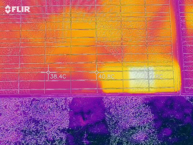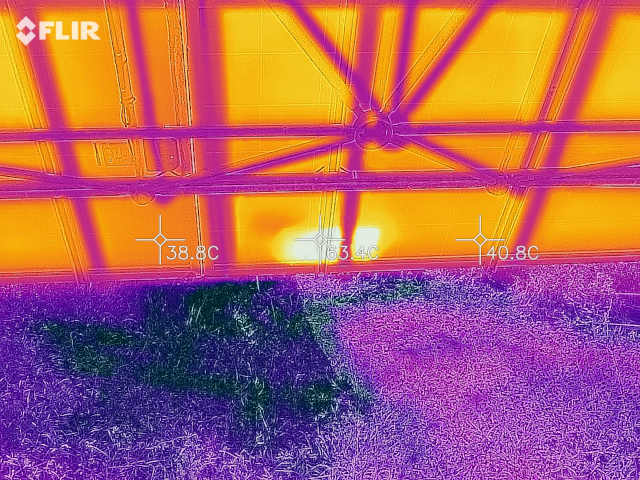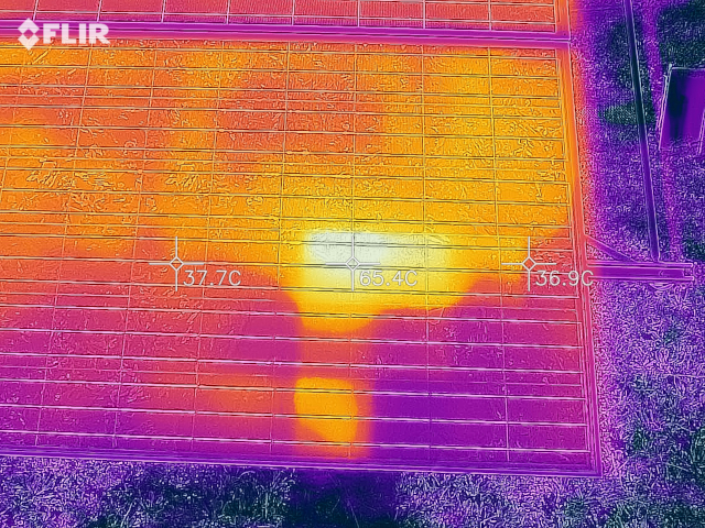 Indicative color-coded thermal images of photovoltaic panels with hotspots are shown in the following photos. Yellow colored areas are areas with higher temperatures.